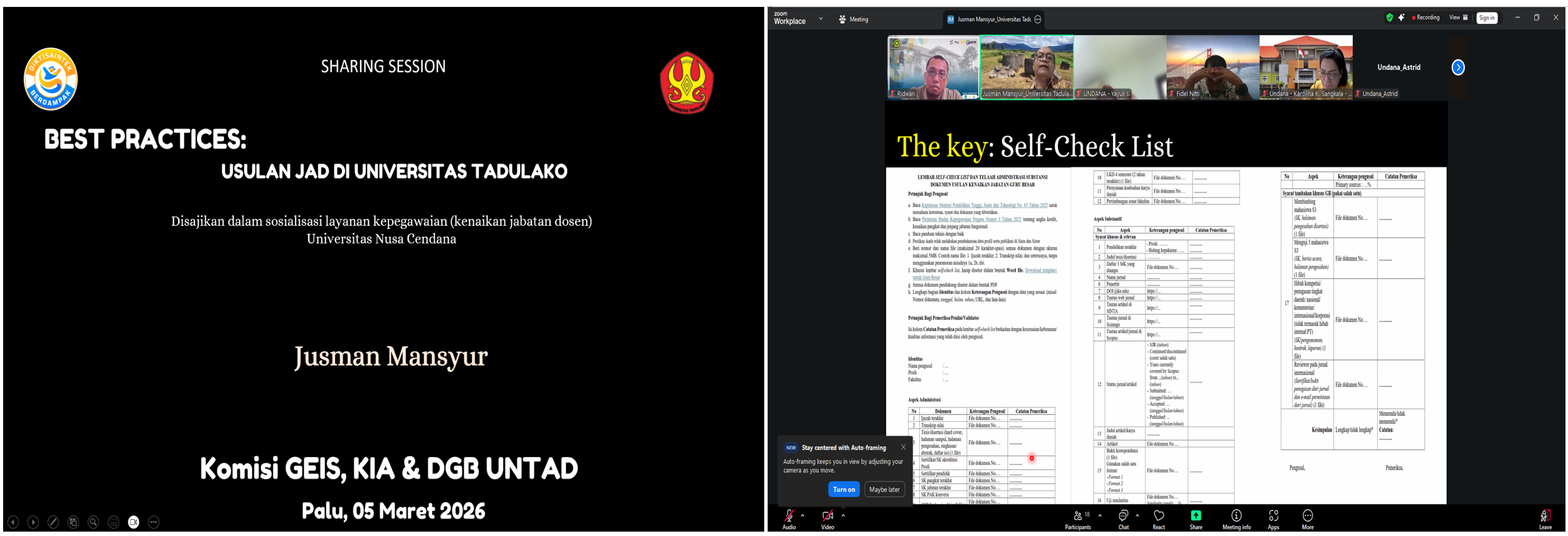 Salah satu poin penting yang disampaikan adalah penggunaan panduan teknis dan Standard Operating Procedure (SOP) pengusulan jabatan akademik yang telah dikembangkan di Universitas Tadulako. Panduan tersebut bertujuan membantu dosen melakukan pengecekan mandiri terhadap seluruh dokumen yang diperlukan sebelum pengajuan dilakukan. Selain itu, sistem self-check list yang diterapkan menjadi instrumen penting dalam memastikan kelengkapan administrasi dan substansi akademik. Dengan mekanisme tersebut, dosen dapat mengetahui lebih awal bagian mana yang masih perlu diperbaiki sebelum dokumen masuk ke tahap penilaian internal eksternal.